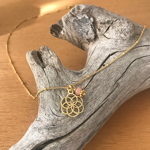 Filigrane Kette mit 1mm-Kugeln aus vergoldetem Silber 925. Die Kette wird mit zwei kleinen Anhängern geliefert: 1x “Saat des Lebens” und 1x pfirsichfarbiger Mondstein.